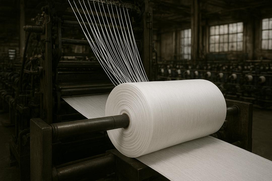 پارچه تولید شده، به صورت رولهای بزرگ جمعآوری میشود تا برای مرحله دوخت و برش آماده باشد.