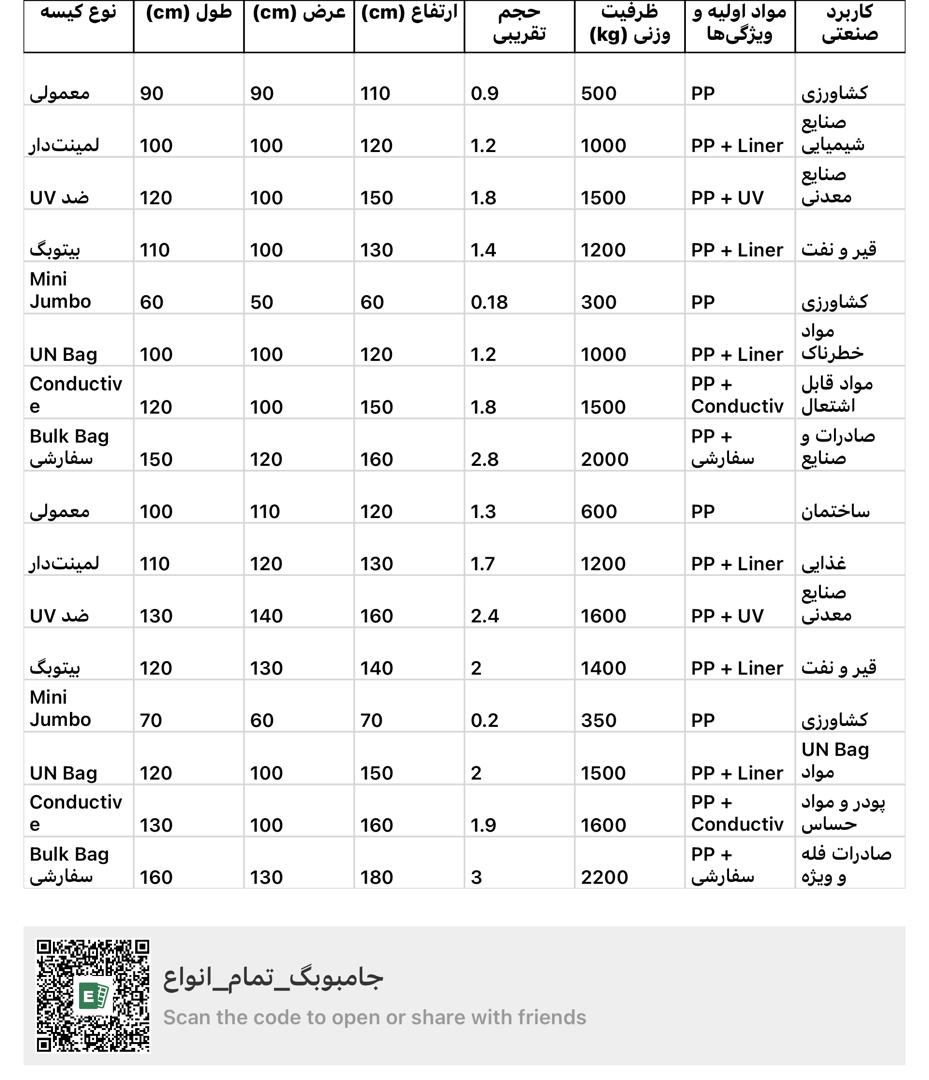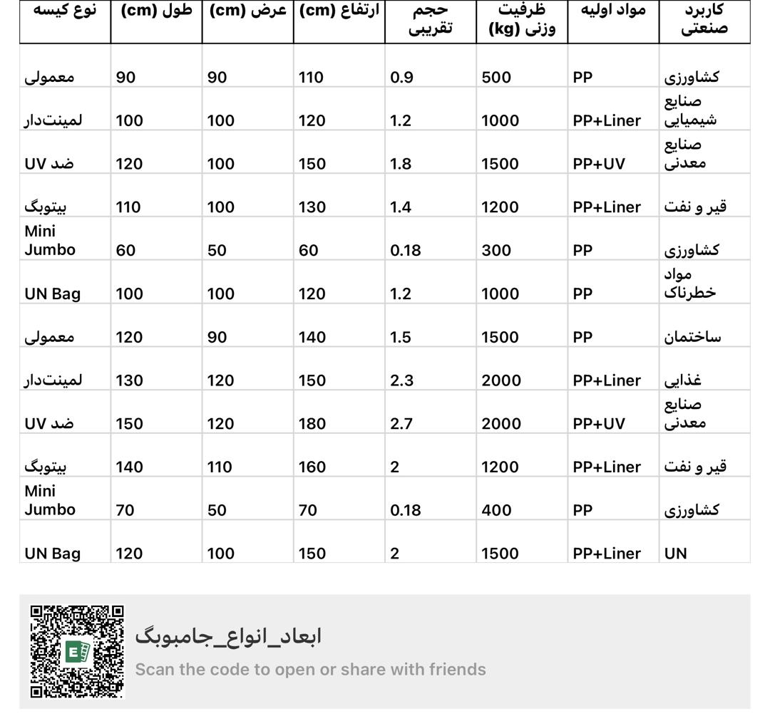 🟨 جدول شماره ۱: حجم و وزن کیسه جامبوبگ (Volume / Weight Table)
